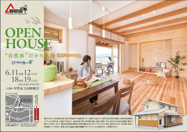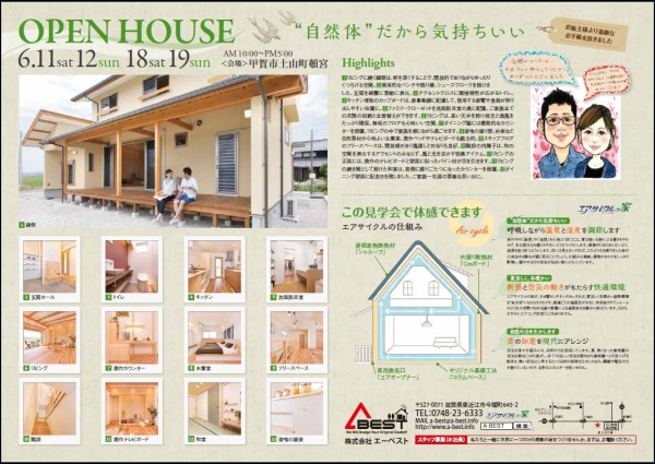 エアサイクル工法と自然の力をうまく取り入れた注文住宅の完成見学会チラシ。お施主様をモデルに撮影をし、仲のいいご夫婦の愛=つながりと、室内と外との家のつながりを写真で表現しました。