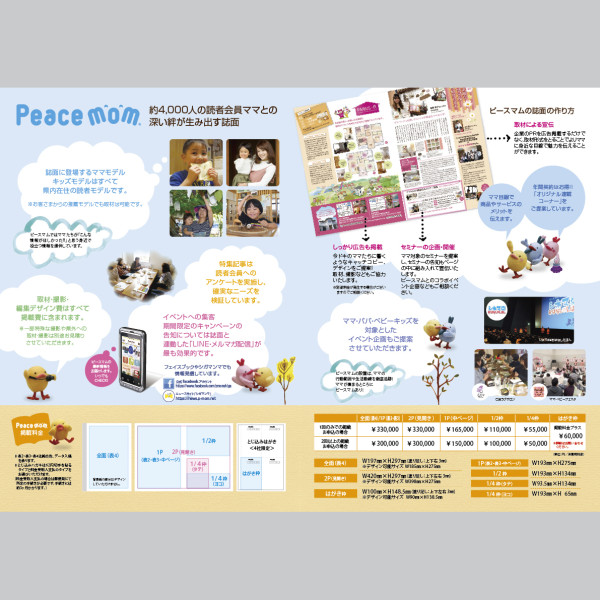 子育て中のママ向けフリーマガジン「ピースマム」媒体資料ポスター・ロゴ・DM発送